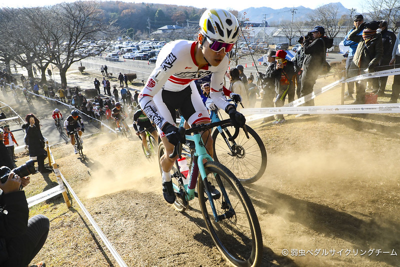 キャンバーセクションは、泥のためランニングでの攻略しかなかったが、松村選手はスパイクピン未装着のためか、攻略に少してこずっているようだった。自分はその度に少し前に出ることもあったが、同じように直線で取り返されてしまう展開の繰り返しだった。